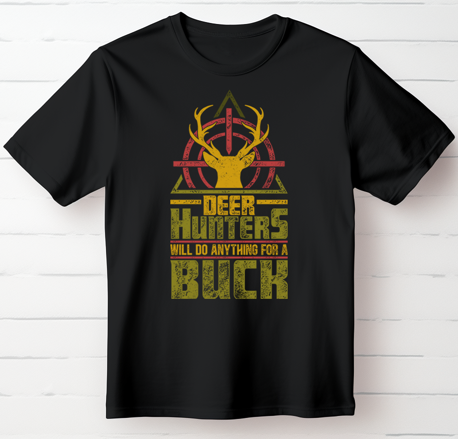 The front graphic shows a deer head with antlers positioned inside a crosshair. Below the image, the text reads “Deer Hunters will do anything for a buck.” All elements appear exactly as shown, including spelling and layout, without added meaning or interpretation.