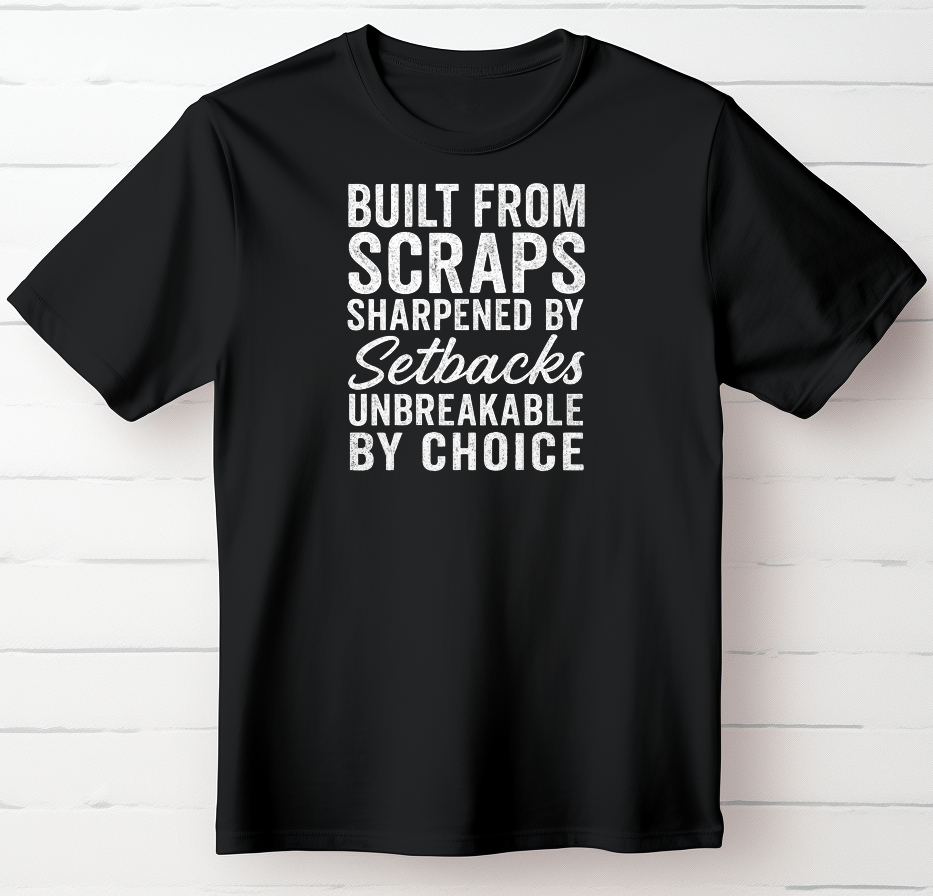 This unbreakable spirit outdoor shirt represents the journey from struggle to strength. “Built From Scraps. Sharpened By Setbacks. Unbreakable By Choice.” is a statement for people who rebuild themselves and rise stronger each time life pushes back.
